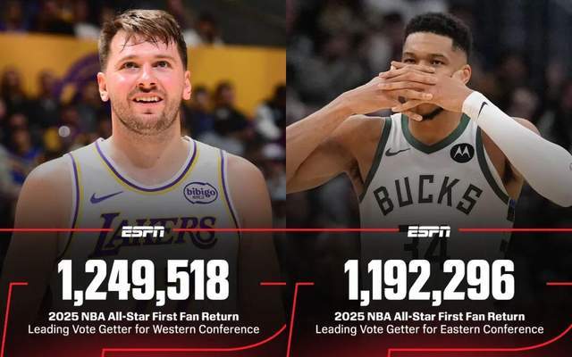 先從數(shù)據(jù)統(tǒng)計來看,目前公布的西部票王,來自于詹姆斯隊友東契奇,以1249518票斷檔領跑所有人。而東部票王,則給到了字母哥,統(tǒng)計票數(shù)1192296票。